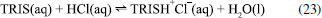 Observe que no exemplo o tampão foi estabelecido após o deslocamento do equilíbrio do fosfato de sódio até o equilíbrio correspondente ao tampão em questão, ou seja, adotamos o procedimento inverso do primeiro exemplo supracitado. Aqui, partimos das bases conjugadas e adicionamos um ácido forte para deslocamento de equilíbrio, conforme o esquema: ![]() No exemplo, a concentração total da solução tampão é de 100 mmol L-1, conforme o cálculo da expressão 21: ![]() Destaca-se que uma vez que estamos trabalhando com as reações inversas, ou seja, a partir das bases conjugadas, os valores de pKa também devem ser convertidos em valores de pKb para inserção no banco de dados, conforme indicado também na Figura 6. Consequentemente, nesse caso estamos monitorando o pOH, logo, ao preencher as lacunas de concentração de reagente e prosseguir com o procedimento por tentativa e erro, deve-se buscar pelo valor do pOH, conforme a expressão 22: ![]() A dedução entre a relação de pKa e pKb e pH e pOH está detalhada no Material Suplementar. Por fim, uma vez estabelecido os reagentes e as concentrações de cada um destes, basta calcular os volumes e massas necessários para o preparo do tampão. Cálculo do ajuste de força iônica de uma solução tampão Agora, vamos supor que seja necessário preparar uma solução tampão (Tris(hidroximetil)amino metano/HCl), ou resumidamente (Tris/HCl), de pH 8,0 com força iônica de 100 mmol L-1. Fazendo os cálculos pelo PeakMaster® temos que para o preparo dessa solução podemos adicionar uma massa de Tris para o preparo de uma solução 100 mmol L-1 e um volume de HCl para o preparo de uma solução 50 mmol L-1, conforme apresentado na Figura 7.