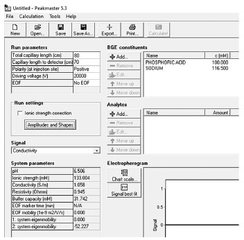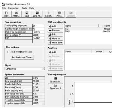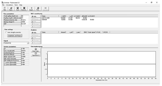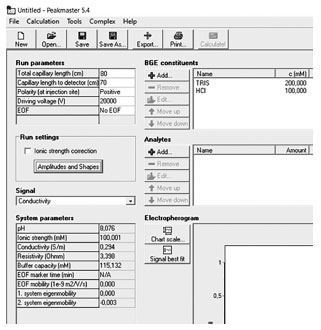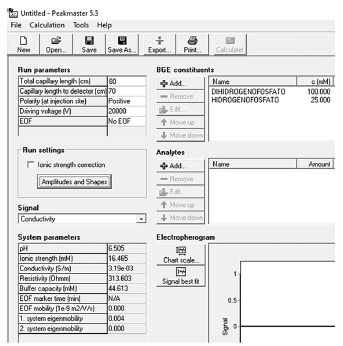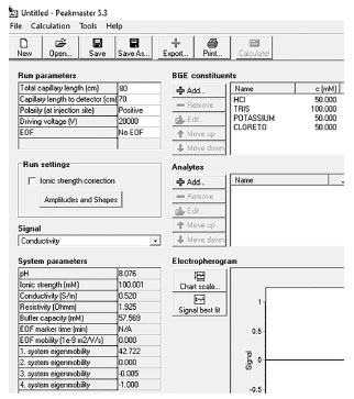![]() Figura 7. Interface principal do software PeakMaster® após inserção de dados para cálculo de pH e força iônica do tampão (Tris/HCl)
