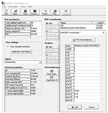 No exemplo indicado, foram inseridos o pKa na lacuna "pKa(-1)" e um número positivo aleatório na lacuna da mobilidade "μ(-1)" para insersão do ácido clorídrico (HCl) no banco de dados.26 Ácidos fortes como o HCl são completamente dissociados em água, por isso são estimados valores de Ka tendendo ao infinito, consequentemente, valores negativos de pKa.4 Cálculo da concentração dos reagentes para o preparo de uma solução tampão Supondo que seja necessário preparar uma solução tampão de pH 6,50. Nesse caso, poderia ser escolhido o sistema dihidrogenofosfato/hidrogenofosfato (NaH2PO4/Na2HPO4) (pKa 7,21). Como discutido anteriormente, quando pKa ≠ pH, o tampão não está em sua máxima capacidade tamponante, porém, desde que esteja entre pKa ± 1 ainda funciona eficientemente como um tampão. Destaca-se que a capacidade tamponante também é calculada pelo PeakMaster®. Esse sistema pode ser otimizado de diferentes formas dependendo dos reagentes disponíveis no laboratório, seja partindo do ácido fosfórico (H3PO4) e de uma base forte como o hidróxido de sódio (NaOH), ou do fosfato de sódio (Na3PO4) e de um ácido forte como o ácido clorídrico (HCl), ou diretamente da mistura dihidrogenofosfato de sódio (NaH2PO4) com o hidrogenofosfato de sódio (Na2HPO4) ou outro contraíon compatível. No entanto, quais seriam as concentrações necessárias de cada um dos reagentes selecionados? Esse problema pode ser solucionado usando o PeakMaster®! De acordo com o passo-a-passo, o usuário pode inserir os reagentes disponíveis com valores de concentrações arbitrários e por método de tentativa e erro ajustar tais concentrações até atingir o pH desejado. A partir do ácido fosfórico e do hidróxido de sódio Por esse procedimento temos que a proporção necessária para o preparo seria de, por exemplo, 100 mmol L-1 de ácido fosfórico e 116,5 mmol L-1 de uma solução de hidróxido de sódio para obtenção de um tampão (NaH2PO4/Na2HPO4) com concentração total de 100 mmol L-1 e pH 6,5, de acordo com os resultados calculados pelo PeakMaster®, conforme apresentado na Figura 4.