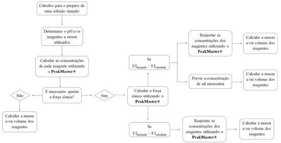 Vale lembrar que nesse exemplo temos um tampão preparado a partir de uma base fraca (TRIS) e seu ácido conjugado (TRISH+), cujo equilíbrio é atingido em virtude da adição de um ácido forte, aqui exemplificado com o HCl, conforme a expressão do equilíbrio 23: ![]() Uma vez calculadas as concentrações, basta calcular as respectivas massas e volumes dos reagentes, conforme comentado nos exemplos anteriores. Esquema simplificado De modo geral, acreditamos que os exemplos supracitados sejam suficientes para o usuário adquirir domínio no uso do software, bem como, entender os cálculos e adquirir o know how necesário para mediar o preparo de uma solução tampão, com ou sem controle da força iônica. Em resumo, as etapas dos cálculos e demais considerações a serem realizadas durante o procedimento completo de preparo de uma solução tampão estão detalhadas no fluxograma da Figura 10.