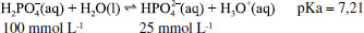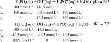 Nesse exemplo, após dissociação dos sais em meio aquoso, o tampão é estabelecido diretamente pelo equilíbrio correspondente ao mesmo, conforme o esquema: ![]() No exemplo, a concentração total da solução tampão é de 125 mmol L-1, conforme os cálculos da expressão 20: ![]() Vale lembrar que, para ser possível o cálculo dessa solução partindo desses reagentes usando o PeakMaster®, informações dos mesmos devem ser adicionados ao banco de dados do software. No entanto, nesse caso algumas considerações devem ser feitas. Primeiramente, devemos inserir na plataforma informações das espécies ácidas e/ou básicas que resultam da dissociação dos sais em questão e seus respectivos valores de pKa e/ou pKb. Destaca-se que assim deve ser feito sempre que o composto de interesse para o cálculo é um sal. Lembre-se ainda que nesse caso a intenção é controlar as concentrações de compostos em diferentes direções de um mesmo equilíbrio, sendo o dihidrogenofosfato a espécie ácida e o hidrogenofostafo sua base conjugada. Sendo assim, devemos inserir os compostos separamente de acordo com seu comportamento em solução para que cálculo seja correto. Dessa forma: ![]() Para isso, basta adicionar ao software as informações pertinentes do ácido, inserindo o valor de pKa na lacuna "pKa(-1)", bem como as informações da base conjugada, inserindo o valor de pKa na lacuna "pKa(+1)", de acordo com o procedimento de modificação de banco de dados descrito anteriormente. Assim, os dois compostos principais do tampão em questão estarão disponíveis para serem usados nos cálculos. A dedução entre a relação de pKa e pKb está detalhada no Material Suplementar. A partir do fosfato de sódio e do ácido clorídrico Por esse procedimento temos que a proporção necessária para o preparo seria de, por exemplo, uma massa de fosfato de sódio correspondente a uma solução de 100 mmol L-1 e 116,5 mmol L-1 de uma solução de ácido clorídrico para obtenção de um tampão (NaH2PO4/Na2HPO4) com concentração total de 100 mmol L-1 e pH 6,5, de acordo com os resultados calculados pelo PeakMaster®, conforme apresentado na Figura 6.