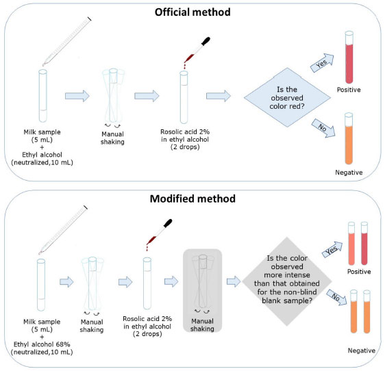 ![]() Figure 1. Schematic representation of the rosolic acid qualitative methods for the detection of acid neutralizers in milk: official and modified methods (modified steps in gray)