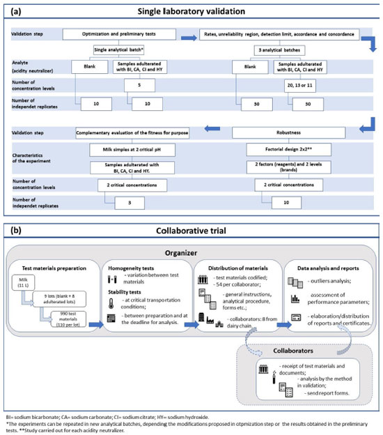 ![]() Figure 2. Schematic representation of the validation processes of the rosolic acid methods for the detection of acid neutralizers in milk. (a) Single validation process of rosolic acid methods. (b) Collaborative trial (interlaboratory validation) of the modified method