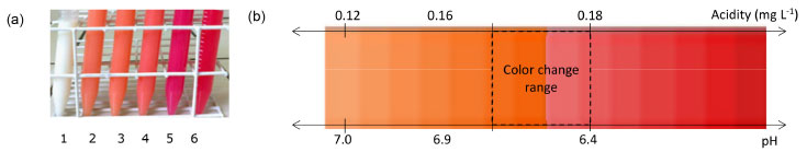 ![]() Figure 3. (a) Colors observed in the rosolic acid method for the detection of acid neutralizers in milk. (b) Color scale for the rosolic acid method and associated acidity and pH values; 1) raw milk sample without adulteration: white color (color index: 255r, 255g, 255b); 2) raw milk sample without adulteration after the addition of ethyl alcohol and rosolic acid: salmon color (color index: 247r, 149g, 91b) = NEGATIVE RESULT; 3) raw milk sample adulterated with acid neutralizer after the addition of ethyl alcohol and rosolic acid: salmon color with the same intensity as sample 2 (color index: 247r, 150g, 91b) = NEGATIVE RESULT; 4) raw milk sample adulterated with acid neutralizer after the addition of ethyl alcohol and rosolic acid: light pink color (color index: 250r, 128g, 114b) or salmon color (more intense than sample 2) = POSITIVE RESULT; 5 and 6) raw milk samples adulterated with acid neutralizer after the addition of ethyl alcohol and rosolic acid: pink colors with different tones (color indexes: 220r, 89g, 92b and 220r, 89g, 103b) = POSITIVE RESULT. The established pattern in the red, green and blue (RGB) system was obtained by comparison of the visualized colors for positive and negative samples with colors presented by Krause19.