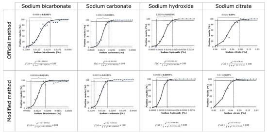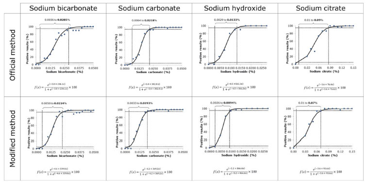 For both methods, the analysis of blank samples resulted in a SLR and RLR of 100% and a zero FPR, indicating the selectivity of the rosolic acid method. In samples with BI added, considering the official method, a 0% FNR was obtained from 0.0425% BI. For the modified method, a first 0% FNR was estimated at 0.0275% BI, although, at higher concentrations, FNRs between 10 and 3.3% were still observed. In the analysis of samples containing CA, the official method provided a 0% FNR from 0.0225% CA. However, for the modified method, a 0% FNR was estimated from 0.0250% CA, with the exception being at 0.030% CA, with a FNR of 3.3%. FNR values of 0% were obtained at levels greater than or equal to 0.0175% for samples with HY added in both methods. Regarding CI, in the official method, 0% FNRs were observed from 0.09 and 0.08% CI, respectively, for the official and modified methods. However, at higher levels, a 3.3% FNR was also obtained. The occurrence of false negatives results at high analyte concentrations could be a consequence of failures in sample preparation, analytical procedure or interpretation of the results by the analyst. Silva et al.10 evaluated milk samples adulterated with HY at 0.01, 0.025, 0.05, and 0.1% by the rosolic acid method. In this study, only samples with 0.1% HY were classified as positive.10 A better performance was observed in the validation of the official method, in which, for 0.01% and levels above 0.02%, 80 and 100% positive results were observed, respectively. In the modified method, for the concentration of 0.01%, the rate of positive results was even higher at 93.3%, indicating the performance improvement of this version. Mid-infrared spectroscopy (MIR) methods with different multivariate classification techniques have been used to identify raw milk adulteration by the addition of acid neutralizers, such as the work reported by Cassoli et al.26 In the experiment performed by these authors, all samples with 0.05% BI added were correctly identified as adulterated and 93.9% of samples adulterated with 0.075% CI were correctly classified. MIR was also evaluated with the soft independent modelling of class analogy (SIMCA) technique in a sequential strategy to detect adulterants in milk, although at higher levels. The MIR/SIMCA method was considered appropriate to detect samples added with 0.4% CA and 0.65% CI but not suitable to detect milk adulterated with BI and HY at 0.4%.27 Comparing these works with our study, the results were similar or better results. However, here the analytical technique employed was simpler and did not require the use of expensive equipment or software. Considering samples with BI, ACC and CON values lower than 0.8 were estimated for both versions of the method, and these results can be attributed mainly to the performance of the first analytical batch (Table 1). Once more, these results could be attributed to failures in sample preparation, analytical procedure or interpretation of the results by the analyst, which were becoming suitable in the following analytical batches. For the modified method, the performance of the first analytical batch only affected the CON value, and thus, the method could be considered standardized under intermediate precision conditions (Table 1). For ACC and CON results for samples adulterated with CA and CI, it was observed that, for levels outside the UR, ACC and CON values were higher than 0.8, which demonstrated the repeatability and intermediate precision of both versions of the method for these two analytes. Considering samples spiked with HY, ACC and CON values were higher than 0.8, except for one occurrence in each method. Thus, the method was considered standardized for most analytes under conditions of repeatability and intermediate precision. In Figure 4, the performance curves and respective experimental data for the four acid neutralizers for the official and modified methods are presented. URs and LODs are also showed in highlight. The regression assumptions were confirmed (p > 0.05).