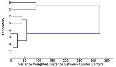 ![]() Figure 5. Hierarchical cluster analysis (HCA): dendrogram with distances between laboratory collaborators