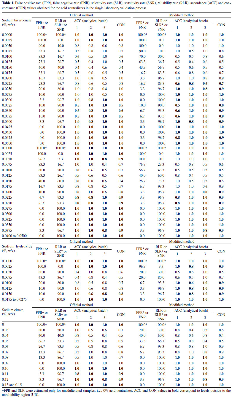 CONCLUSIONS The rosolic acid qualitative test for the detection of acid neutralizers in milk was validated by single laboratory process for both the official and modified versions, indicating that the proposed modifications improved the method performance. In general, this full validation process of the modified version indicated the application of the rosolic acid method to detect the neutralization of milk samples with acidity values slightly above the limit of the legislation, and its restrictions in the detection of weak bases added to high acid milk.