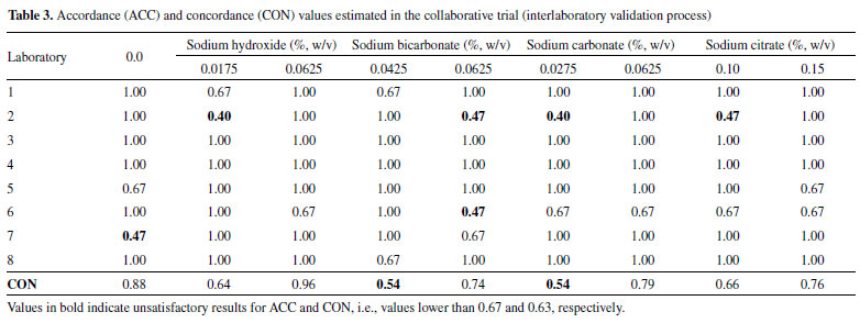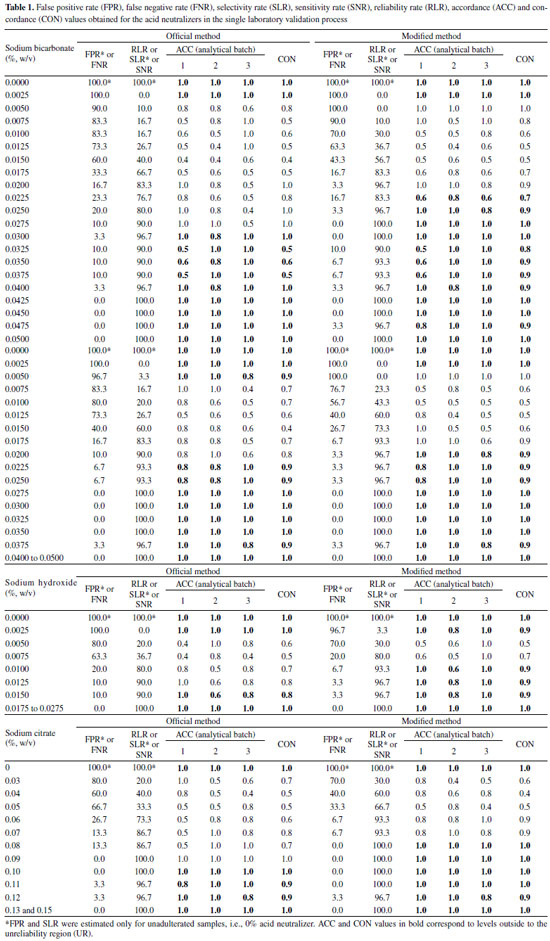 Thus, the analytical procedure of the modified method consisted of adding 10 mL of ethyl alcohol (68%) neutralized to a 5 mL of milk sample, followed by manual shaking and addition of two drops of rosolic acid 2% in ethyl alcohol. After a second stage of manual shaking, the color observed was compared with that obtained for a non-blind blank sample previously submitted to the same procedure (Figure 1). Single laboratory validation Evaluation of rates, unreliability region, detection limit, accordance and concordance The estimated values of rates, ACC and CON for each adulterant and concentration can be found in Table 1.