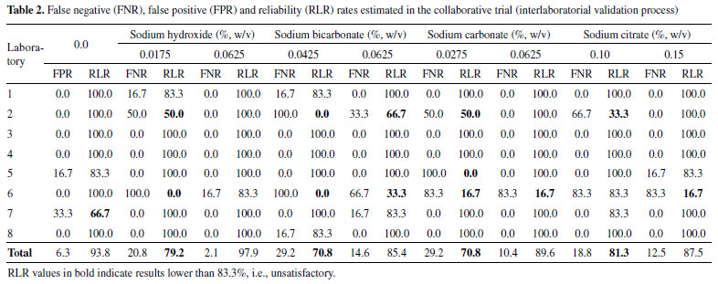 Still analysing the overall results for the adulterated materials, FNRs between 2.1 and 29.8% were observed. Satisfactory results of the RLR (≥ 83.3%) were obtained only for the materials adulterated with the highest concentration of each neutralizer. Individually, Laboratories 2 and 6 presented worse performance in relation to the FNR (Table 2). Similar behavior was observed for the ACC values, with Laboratory 2 presenting a poor performance. Unsatisfactory CON values (less than 0.63) were obtained just for test materials adulterated with 0.0425% BI and 0.0275% CA. (Table 3). These unsuitable results could be attributed to the lack or inadequate use of the non-blind blank sample and color standards. In fact, Laboratory 2 reported difficulties in comparing the colors with the non-blind blank sample and consequently identifying a positive result, as presented in the section 3.3.4 (Comment of collaborators). However, problems were not reported by Laboratory 6.