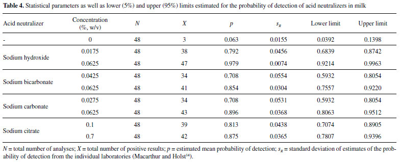 In addition, it is important to highlight that the difference in the acidity levels of the samples used in this process was different those employed in the single laboratory validation. In the collaborative trial, samples had acidity above the legislation limit, which did not always occur in single laboratory validation. Thus, the difference in the acidity of samples could explain the inferior performance obtained in the collaborative trial, since the complementary evaluation of the fitness for purpose indicated a method limitation in detecting adulterated samples with high levels of acidity. Table 4 shows the prediction intervals for the probability of detection as well as the statistical parameters used in the calculation of these intervals. Statistical calculations, performed according to Macarthur and Holst's protocol,14 corroborate the results presented by the estimates of rates, ACC and CON values. The probability of obtaining false positive results was calculated as 0.06, confirming the selectivity of the method. For materials adulterated with HY and CI, the detection probabilities were higher than 0.80, while for the tests with CA and BI added, the probabilities of detection were estimated between 0.708 and 0.896. These probability values indicated a greater sensitivity of the method to the higher levels of acid neutralizers. Regarding the variability of the results presented between the laboratories, that is, the intermediate precision, a significant variation in the prediction intervals is observed for the probability of detection of the neutralizers.