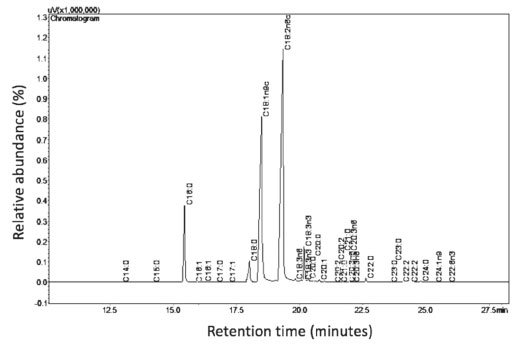 RESULTS AND DISCUSSIONS Chemical composition Fucus vesiculosus oil The chromatogram of the fatty acid composition present in Fucus vesiculosus oil (FVO) as a function of the retention time versus the resulting peak intensity is shown in Figure 1.
