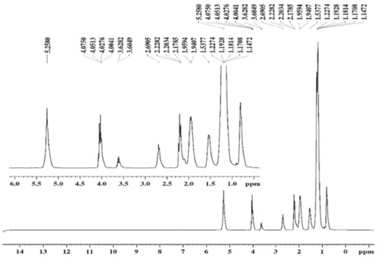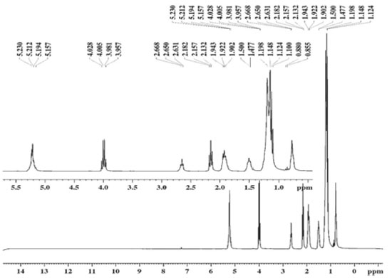 ![]() Figure 2. 1H-NMR spectrum (300 MHz, CDCl3) of ethyl biodiesel obtained from Fucus vesiculosus oil (EBFVO)