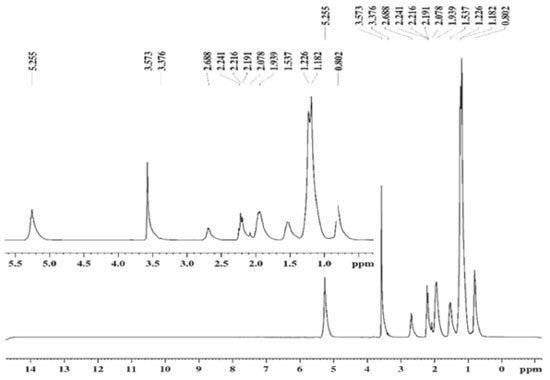 ![]() Figure 3. 1H-NMR spectrum (300 MHz, CDCl3) of methyl biodiesel obtained from Fucus vesiculosus oil (MBFVO)