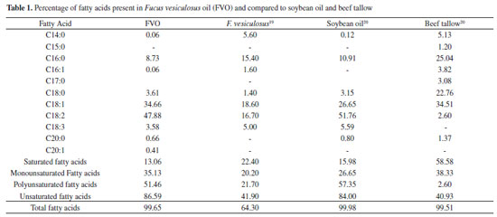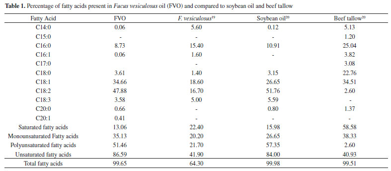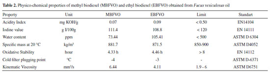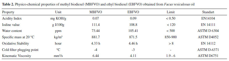 CONCLUSIONS This work evaluated the fatty acid composition of the macroalgae Fucus vesiculosus oil (FVO). The fatty acids present in greater quantities were linoleic acid (C18:2 - 47.88%), and oleic acid (C18:1 - 34.66%) and unsaturated fatty acids correspond to 86.59% of the composition of the FVO and it is similar to the composition fatty acids from soybean oil, which is the most produced and used oil for the production of biodiesel. FVO was used as raw material for the production of methyl biodiesel (MBFVO) and ethyl biodiesel (EBFVO), with molar ratio oil: alcohol 1:3 and 1% alkaline catalyst. Both biodiesels showed higher yield with a reaction time of 60 minutes. The physico-chemical properties were evaluated and the oxidative stability showed an induction period below the recommended value, but this property can be improved with the addition of an antioxidant substance to biodiesel. The other physical-chemical properties showed values within the stipulated by the regulatory agencies, showing that the macroalgae Fucus vesiculosus is a potential raw material for biodiesel production.