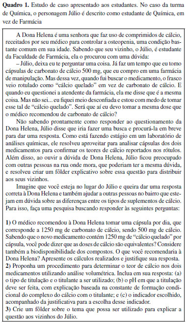 METODOLOGIA Ao usar um Estudo de Caso, o professor não fornece as informações ou os produtos da Ciência, mas age como um orientador, desafiando e envolvendo os estudantes em um caso que exige interação com o conteúdo. Não se trata de método de ensino inovador, mas que pode trazer contribuições para o envolvimento dos estudantes com um caso específico e a consequente inserção de conceitos científicos. Com base nesse entendimento, optamos por fazer uso de estudos de caso no ensino superior. Partimos da hipótese de que se trata de uma oportunidade promissora de construir, junto aos estudantes, a ideia da direta relação entre os conceitos científicos e a atividade profissional futura. Essa experiência com estudo de caso foi realizada em duas turmas de graduação, da UFMG, no segundo semestre de 2019. Passamos, a seguir, a descrever as turmas e o modo como o estudo de caso foi organizado. Caracterização das turmas A primeira turma na qual o estudo de caso foi aplicado tinha um total de 25 estudantes, pertencentes aos cursos de Licenciatura em Química, Bacharelado em Química e Química Tecnológica. O estudo de caso fez parte de uma atividade da disciplina Análise Quantitativa, de 75 horas, que geralmente é cursada no 5º ou 6º período do curso e cuja ementa inclui os quatro tipos de volumetrias (ácido-base, precipitação, complexação e oxirredução). A disciplina tem um componente prático e um teórico, sendo que o estudo de caso foi incluído na parte teórica. A segunda disciplina em que o estudo de caso foi usado é Química Analítica, de 105 horas, disciplina teórico-prática oferecida pelo Departamento de Química para os alunos do 4° período dos cursos noturno de Farmácia e Biomedicina. Essa turma tinha 52 estudantes frequentes. Organização do Estudo de Caso O estudo de caso foi proposto em conjunto pelas duas professoras que ministravam as disciplinas em que ele foi usado. Na elaboração do caso foram consideradas as características de um "bom estudo de caso"31, amplamente descritas por pesquisadores7 que usam estudos de caso em sala de aula. No Quadro 1 se encontra o texto entregue aos estudantes que, além de apresentar o caso a ser resolvido (questão 1), solicitava a proposição de um procedimento para determinar o teor de cálcio dos dois medicamentos (questão 2) e a realização de uma atividade de divulgação científica (questão 3), dirigida ao público leigo. Os estudantes também receberam indicação de duas referências bibliográficas17,32 para auxiliar no desenvolvimento da atividade. Na disciplina de Análise Quantitativa, o caso foi apresentado aos estudantes durante as aulas de volumetria de complexação, nas quais a professora deu orientações em relação às questões e à bibliografia e combinou com os estudantes o prazo para realização das atividades. Os estudantes foram deixados livres para se organizarem em grupos com até cinco participantes, o que resultou na formação de cinco grupos de 3 a 5 estudantes, uma dupla, e dois estudantes que preferiram realizar a atividade individualmente. Na disciplina Química Analítica o caso foi entregue por meio da plataforma Moodle. Na aula seguinte à entrega, a professora usou um tempo de 30 minutos para explicar o estudo e tirar as dúvidas. Foram formados 8 grupos com cerca de 6 alunos por grupo. Cada um desses grupos tinha um representante que era responsável por tirar as dúvidas com a professora durante o desenvolvimento da atividade e, ainda, avaliar os colegas do grupo.