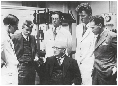 ![]() Figura 2. Haber sentado ao centro no Instituto Kaiser Wilhelm de Físico-Química e Eletroquímica, da esquerda para a direita: Eric Flint. v. Schweinitz, P. Goldfinger, Paul Harteck, Ladislaus Farkas, em 1930. Fonte: Arquivos da Sociedade Max Planck, Berlim/ Foto: VIII.1/3, autor desconhecido