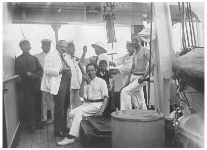 ![]() Figura 4. Expedição "Ouro na água do Mar", Haber, em pé, a bordo do navio com destino ao Brasil, sentado: G. Lehrcke, atrás com um capacete: Hans Eisner e na extrema direita: Fritz Matthias, 1923. Fonte: Arquivos da Sociedade Max Planck, Berlim/ Foto: X/2, autor desconhecido