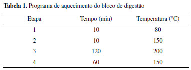PARTE EXPERIMENTAL Equipamentos e parâmetros instrumentais Para a determinação multielementar das concentrações de Ba, Bi, Ca, Cd, Co, Cr, Cu, Fe, K, Mn, Pb e Zn nas amostras de casca de uva foi utilizado o espectrômetro de emissão óptica com plasma induzido por micro-ondas (MIP OES) modelo 4200 (Agilent Technologies, Austrália), equipado com um detector CCD (do inglês, charge-coupled device), monocromador Czerny-Turner com distância focal de 600 mm, com uma faixa de comprimento de onda de 178-780 nm e sistema de introdução de amostras multimodal. O nitrogênio gasoso (N2) utilizado para operação do plasma foi obtido através de um gerador de nitrogênio, modelo 4107 (Agilent Technologies), que produz N2 com pureza superior a 99,5%. As determinações foram feitas na posição axial. Todas as medidas foram feitas em triplicata com um tempo de integração de três segundos e velocidade de rotação da bomba peristáltica de 15 rpm. Os sinais de fundo foram corrigidos de forma automática pela subtração entre os espectros do branco e das amostras. As condições operacionais do MIP OES estão apresentadas na Tabela 1S. As amostras de casca de uva passaram por um processo de homogeneização em um liquidificador (400 W de potência, Arno, Brasil). Em seguida, foram pesadas utilizando uma balança analítica com resolução de 0,1 mg e tara máxima de 210 g (Modelo AR 2140, Ohaus Adventurer, EUA). Para a etapa de decomposição ácida das amostras foi utilizado um bloco digestor convencional (Modelo MA-4025, Marconi, Brasil). Em cada tubo digestor de vidro foi acoplado um sistema de refluxo para evitar perdas por volatilização de analitos e reagentes. O sistema consiste em um tubo de vidro fechado preenchido com água, que é recirculada a uma temperatura de 15 °C, controlada através de um banho termostatizado (Modelo Q214S2, Quimis, Brasil).29 Para o estudo da fração bioacessível foi utilizado um pHmetro (Modelo PHS-3B, PHTek, Brasil), um banho Dubnoff com aquecimento e agitação (Modelo Q226M2, Quimis, Brasil) e uma centrífuga Eppendorf (Modelo 5804 R, Alemanha). Materiais e reagentes Os reagentes utilizados foram de grau analítico e as soluções empregadas foram preparadas com água desionizada, obtida por um sistema de purificação de água Direct-Q 3 (Millipore Corporation, EUA), com resistividade de 18,3 MΩ cm. Ácido nítrico 65% (v/v) (Synth, Brasil) foi purificado através de um sistema de sub-ebulição de quartzo (MA-075, Marconi, Brasil). Antes do uso, os materiais de vidro foram lavados e imersos em um banho de HNO3 10% (v/v) por um período de 48 horas, enxaguados com água desionizada e secos a temperatura ambiente. As soluções padrão dos analitos foram preparadas diariamente em meio ácido a partir de uma solução estoque contendo 100 mg L-1 para Ba, Cd, Co, Cr, Cu, Mn, Mo, Pb e Zn (Sigma-Aldrich, EUA), 10.000 mg L-1 para K e Fe (Merck, Alemanha) e 1000 mg L-1 para Ca (Merck, Alemanha). Para o método de decomposição ácida, foram utilizados H2O2 30% (v/v) (Dinâmica, Brasil), HNO3 65% (v/v) bidestilado (Neon, Brasil) e pérolas de vidro. Para a geração química de vapor, foram utilizadas soluções de NaBH4 0,5% (m/v) estabilizada em meio alcalino com NaOH 0,5% (m/v). Os reagentes utilizados para os estudos de bioacessibilidade foram: KCl, NaCl, KH2PO4, MgCl2(H2O)6 (Synth, Brasil), NaHCO3 e HCl (Merck, Alemanha), (NH4)2CO3 (J.T. Baker, EUA), α-Amilase da Aspergillus oryzae (Sigma 86250, China), Pepsina (Sigma P7000, Suíça), Bile (Sigma B8631, Nova Zelândia) e Pancreatina 3x (Sigma P1625, EUA). Para a pesagem das amostras o meio de suporte utilizado foi papel de cigarro transparente, cem por cento (100%) celulose (aLeda, Brasil). Preparo das amostras As uvas das cultivares Tannat e Cabernet Sauvignon foram doadas pela vinícola Guatambu, localizada no município de Dom Pedrito, Rio Grande do Sul, Brasil. Foram coletados aproximadamente 1000 g de locais diferentes do vinhedo, de forma a ter uma maior representatividade. Ambas as cultivares encontram-se na mesma propriedade localizada no interior do município, as quais possuem a seguinte localização geográfica: Tannat (Latitude: -30.98811597843 Sul, -54.492673088443 Oeste) e Cabernet Sauvignon (Latitude: -30.9855753741855 Sul, -54. 4943688125776 Oeste). Após a etapa de coleta, as uvas foram lavadas com água ultrapura, Milli-Q, e posteriormente foi feito o desengace manual, separando a casca da polpa e da semente. Em seguida, a polpa foi prensada manualmente a fim de se obter o mosto. As cascas, juntamente com o mosto, foram adicionadas em frascos de vidro para simular o processo de fermentação e, após quatro dias, foram separadas, trituradas e armazenadas em freezer doméstico, em frascos de vidro com tampa rosca. Para o estudo o teor de água (umidade) foram pesados aproximadamente 5 g das diferentes amostras diretamente em béqueres, os quais foram posteriormente levados ao aquecimento em estufa a uma temperatura de aproximadamente 105 °C. Esse processo foi realizado até as amostras adquirirem peso constante. A porcentagem de umidade encontrada nas amostras foi de aproximadamente 40%." Decomposição ácida em bloco digestor com sistema de refluxo - método proposto Cerca de 2,5 g de amostra foram pesados em triplicata, o que corresponde a 1 g de massa seca. A amostras foram pesadas diretamente em papel de cigarro 100% celulose, sendo este devidamente fechado e inserido no tubo de digestão. O procedimento de decomposição seguiu o descrito no trabalho de Pereira et al.,16 baseado no trabalho de Minekus et al.21 Sendo assim, foram adicionados 5 mL de HNO3 65% (v/v) em cada tubo de digestão, na presença de pérolas de vidro, e aos tubos foi adaptado o sistema de refluxo utilizando uma recirculação de água a 15 °C. O bloco de digestão foi submetido ao programa de aquecimento descrito na Tabela 1.