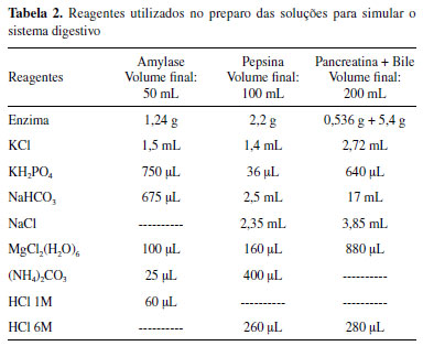 Após a temperatura do bloco baixar para 150 °C e as amostras esfriarem a temperatura ambiente, na etapa 4, foi adicionado 1 mL de H2O2 30% (v/v), e os tubos retornaram ao bloco digestor por mais 60 min. Após o resfriamento da solução, o volume foi transferido para frascos de polipropileno (PP) e avolumado a 20 mL com água desionizada. Decomposição ácida em sistema fechado de alta pressão - método comparativo Para validar o método proposto neste estudo, foi utilizado um sistema fechado com frascos de politetrafluoretileno (PTFE) em bloco digestor. A análise foi feita em triplicata, transferindo para os frascos aproximadamente 250 mg de amostra, que corresponde a 100 mg de massa seca da amostra, na presença de 2,5 mL de HNO3 65% (v/v). Em seguida, os frascos foram fechados e colocados no bloco de digestão por 3 horas, a 140 °C. Depois de esfriar, a solução resultante foi transferida para frascos de PP e diluída a 20 mL com água desionizada, para posterior leitura no MIP OES. Fração bioacessível O procedimento para a avaliação da bioacessibilidade in vitro foi adaptado de Minekus et al.,21 com três etapas consecutivas, que representam o sistema digestivo humano: boca, estômago e intestino. Para o desenvolvimento das respectivas etapas foram preparadas as soluções dos sais que simulam as substâncias ativas do sistema digestivo (saliva, suco gástrico e suco intestinal) (Tabela 2S). Para simular o sistema digestivo, foram adicionados as enzimas e os sais, conforme apresentado na Tabela 2.