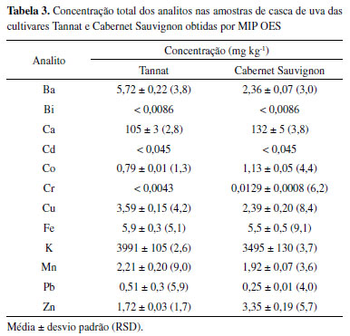 RESULTADOS E DISCUSSÃO Parâmetros de mérito As Tabelas 3S e 4S apresentam os parâmetros de mérito para a quantificação total dos analitos presentes nas amostras de casca de uva e da fração bioacessível, respectivamente, determinados por MIP OES. Foram obtidos bons coeficientes de correlação linear ao quadrado para todos os elementos (R2 > 0,99) em uma faixa linear para o K variando de 0,525 a 5,2 mg L-1 e 0,025 a 0,2 mg L-1 para os demais elementos. Os limites de quantificação do método (LQ(m)) e de detecção do método (LD(m)) obtidos para o método proposto foram menores na determinação da concentração total, exceto para o Zn, o que era esperado, considerando-se a complexidade da matriz utilizada para simular o sistema gastrointestinal humano, que afeta a sensibilidade das medidas analíticas. Avaliação da exatidão Para avaliar a exatidão do método proposto foram feitos testes de recuperação dos analitos em três diferentes níveis de concentrações, obtendo-se recuperações que variaram de 80 a 120%. Os valores de desvio padrão relativo (RSDs) foram inferiores a 10% para todos os elementos, comprovando a exatidão do método proposto, bem como uma precisão adequada, conforme apresentado na Tabela 5S. A Tabela 6S mostra os resultados obtidos no experimento para verificar a exatidão do método de preparo das amostras proposto, utilizando o método de decomposição da amostra de casca de uva da cultivar Tannat em um sistema fechado. Para os resultados obtidos foi aplicado o teste estatístico t Student pareado para um limite de confiança de 95%, observando-se que não há diferenças significativas entre os resultados encontrados na decomposição das amostras com sistema de refluxo em relação à decomposição em sistema fechado em bombas de PTFE. Dessa forma, é possível verificar que o sistema de decomposição ácida com refluxo foi eficiente na decomposição das amostras de casca de uva, possibilitando a subsequente determinação dos analitos. Determinação da concentração total Os resultados da determinação da concentração total dos elementos nas duas cultivares de casca de uva estão apresentados na Tabela 3. É possível observar que para Bi e Cd as concentrações foram inferiores ao LD(m) para ambas as amostras. Por outro lado, a amostra Tannat apresentou concentração inferior ao LD(m) para o Cr, enquanto a concentração desse elemento na amostra Cabernet Sauvignon é inferior ao consumo diário recomendado.19,30