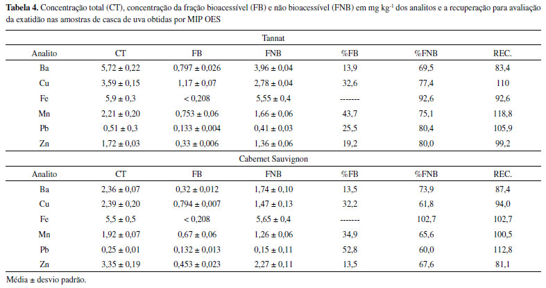 | Avaliação da concentração total e da fração bioacessível de metais em amostras de casca de uva de cultivares tannat e cabernet sauvignon por MIP OES Evaluation of the total concentration and the bioaccessible fraction of metals in samples of grape skins of cultivars tannat and cabernet sauvignon by MIP OES |