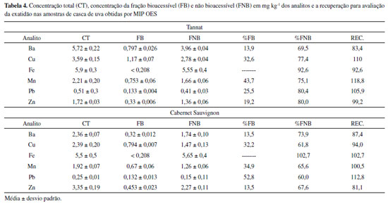 A cultivar Tannat apresentou as maiores concentrações de Ba, Cu, Fe, K, Mn e Pb enquanto a cultivar Cabernet Sauvignon tem as maiores concentrações de Ca, Co e Zn. Embora as duas cultivares tenham sido produzidas na mesma localidade e no mesmo solo, recebendo o mesmo tipo de tratamento, foi possível observar que há uma diferença na absorção dos nutrientes por parte das videiras. De acordo com a literatura, o mesmo comportamento de absorção dos minerais por diferentes cultivares, plantadas no mesmo solo e nas mesmas condições, foi relatado por Ko et al..31 As altas concentrações de K encontradas nas amostras de casca de uva também foram relatadas no trabalho publicado por Mpelasoka et al.,32 onde os autores mencionaram que as maiores quantidades deste elemento estão concentradas na casca, seguido das sementes e da polpa, sendo este elemento transportado via xilema e floema, sendo esta última via a principal entrada de K para a baga. No trabalho desenvolvido por Yang et al.,33 os autores avaliaram a concentração de diversos elementos na casca, polpa e sementes em três diferentes cultivares, entre elas a Cabernet Sauvignon, que apresentou concentrações de 3,0; 2,5; 8,0 e 1,5 mg kg-1 para os analitos Zn, Cu, Fe e Mn presentes na casca, respectivamente, valores muito próximos aos encontrados no presente trabalho. Assim, a composição mineral da casca para esses elementos mostra a existência de um padrão, já que são micronutrientes que auxiliam no desenvolvimento da planta.34 De acordo com a RDC Nº 42 - ANVISA, que dispõe sobre os limites máximos de contaminantes inorgânicos em alimentos, o limite para Pb é de 0,2 mg kg-1 e para o Cd é de 0,05 mg kg-1 para frutas frescas de bagos.35 Desta forma, a concentração total de Pb encontrada para as cultivares analisadas ultrapassa o limite permitido, o que demonstra a necessidade de se ter maior controle em relação aos níveis de contaminantes inorgânicos. Para a Organização Mundial de Saúde, bem como para a Organização das Nações Unidas para a Alimentação e a Agricultura (OMS/FAO), através da Comissão Codex Alimentar,36 o limite máximo de Pb é de 0,1 mg kg-1, o que tornaria ainda mais preocupante a concentração encontrada. Já o Cd apresentou concentrações inferiores ao LQ(m) que é 0,045 mg kg-1, não apresentando riscos de toxicidade ao consumidor para este elemento. Resultados da determinação da fração bioacessível nas amostras de casca de uva Para verificar o que de fato pode ser aproveitado por nosso organismo em termos de nutrientes e elementos potencialmente tóxicos nas amostras de casca de uva analisadas, foi avaliada a bioacessibilidade de Ba, Cu, Fe, Mn, Pb e Zn em ambas as cultivares. É importante salientar que os elementos K e Ca, que estão presentes nas amostras, não foram avaliados nesse estudo, uma vez que estão em concentrações muito elevadas nos reagentes utilizados para simular o sistema gastrointestinal. Sendo assim, é possível observar na Tabela 4 que a recuperação de todas as amostras ficou entre 81 e 120%, mostrando assim a confiabilidade das análises, uma vez que o somatório das frações foi compatível com a concentração total dos respectivos analitos, conforme já relatado por Souza et al..20