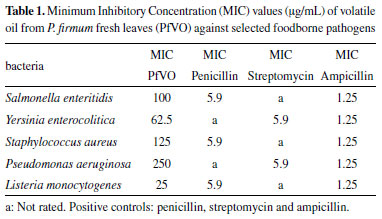 EXPERIMENTAL Plant material Psidium firmum O. Berg (Myrtaceae) fresh leaves were collected in Limeira, (22°33'53"S and 47°24'06"W), São Paulo (SP), Brazil, on October 20th, 2017, at 9 am. The plant was identified by the botanist Walnir Gomes Ferreira Junior, Ph. D., and a voucher specimen (GERAES-13) was deposited in the herbarium in the Biology Department at the Instituto Federal de Educação, Ciência e Tecnologia do Sul de Minas Gerais, located in Machado, Minas Gerais (MG), Brazil. Volatile oil extraction PfVO (100 g; fresh leaves) was extracted by hydrodistillation in a Clevenger-type apparatus for 3 h. The oil was dried over anhydrous sodium sulfate, filtered and stored in a refrigerator at 5 °C, until both gas chromatography-flame ionization detection (GC-FID) and gas chromatography-mass spectrometry (GC-MS) analyses, besides biological assays, were carried out. PfVO yield (percentage content in fresh matter) was determined by Equation 1. ![]() Identification of the chemical composition of PfVO Volatile oil was dissolved in ethyl ether and analyzed by Gas Chromatography-Flame Ionization Detector (GC/FID) and Gas Chromatography-Mass Spectrometry (GC/MS) using the Shimadzu QP5000 Plus and GCMS2010 Plus (Shimadzu Corporation, Kyoto, Japan) systems. The temperature of the column in the GC/FID was programmed to rise from 60 to 240 °C at 3 °C min-1 and was held at 240 °C for 5 min; the carrier gas was H2 at a flow rate of 1.0 mL min-1. The equipment was set to operate in the injection mode; the injection volume of oil solution was 0.1 µL (split ratio of 1:10), and the injector and detector temperatures were 240 and 280 °C, respectively. Percentages of compounds were calculated by the area normalization method, considering response factors. Authentication of compounds found in the essential oil was also determined by standard samples purchased from Sigma Aldrich (Germany). Relative areas consisted of the average of triplicate GC analyses. GC-MS analyses were carried out by a Shimadzu QP2010 Plus (Shimadzu Corporation, Kyoto, Japan) system equipped with an AOC20i autosampler. The column was an RTX-5MS (Restek Co., Bellefonte, PA, USA) fused silica capillary one (30 m × 0.25 mm i.d. × 0.25 µm film thickness). Electron ionization mode occurred at 70 V. and helium (99.999 %) was employed as the carrier gas at constant flow of 1.0 mL min-1. The injection volume was 0.1 µL (split ratio of 1:10). Injector and ion-source temperatures were set at 240 and 280 °C, respectively. The oven temperature program was the same as the one used for GC. Mass spectra were taken at a scan interval of 0.5 s, in the mass range from 40 to 600 Da. This methodology was described by Lemes et al.16 Antileishmanial activity To evaluate antileishmanial activity, L. amazonensis promastigote forms (MHOM/BR/PH8) were maintained in RPMI 1640 (Gibco-Life Technologies, Grand Island, USA) culture medium supplemented with 10% fetal bovine serum (Cultilab, Campinas, BR), penicillin (100 UI mL-1) and streptomycin (100 µg mL-1) (Gibco-Life Technologies). The methodology used for evaluating the anti-Leishmania amazonensis activity of PfVO was the one described by Estevam et al.17 Antibacterial activity The following pathogenic microorganism strains of foodborne pathogens type were obtained from the American Type Culture Collection (ATCC, Rockville, MD, USA): Salmonella enteritidis (ATCC 13076), Yersinia enterocolitica (ATCC 9610), Staphylococcus aureus (ATCC 9144), Pseudomonas aeruginosa (ATCC 14502) and Listeria monocytogenes (ATCC 15313). MIC values were determined by the broth microdilution method, as recommended by the literature,18,19 with modifications. Assays were performed in Mueller Hinton broth. Inoculums were adjusted to 75% transmittance at 660 nm, which corresponds to the 0.5 MacFarland standard (equivalent to 1.5 × 108 CFU mL−1). Samples of PfVO were prepared in absolute ethanol and the initial concentration was 8 mg mL−1. Ethanol provides proper solubility of PfVO in the aqueous culture medium used in the MIC assay. Dilutions were performed in 96-well microplates to obtain serial dilutions of PfVO and reach final concentrations from 0.39 to 400 µg mL-1 (eleven serial dilutions). Microplates were incubated at 35 ± 2 °C for 24 h. A solution of resazurin (0.02%) was used for determining microbial growth, which was visually indicated by changes in color (from blue to pink). The lowest concentration at which color did not vary was considered the MIC value.20 Positive controls were penicillin, streptomycin and ampicillin (both from Sigma-Aldrich, St. Louis, MO) for Gram-positive and Gram-negative bacteria, respectively, at concentrations ranging from 1.25 to 5.9 µg mL-1 (Table 1). The antimicrobial assay was performed in triplicate. The solvent (absolute ethanol), antimicrobial standards and culture media were used as controls.