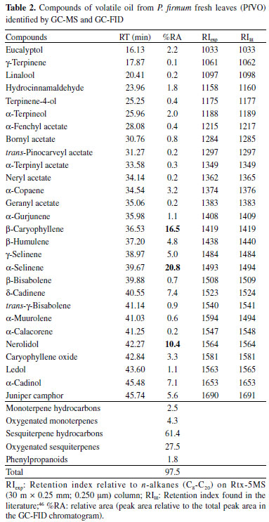 RESULTS AND DISCUSSION Yield and chemical composition of PfVO PfVO was obtained as a faint colorless oil with aromatic odor in 0.5% yield (w/w). Chemical components of PfVO, which were identified by GC-MS and GC-FID analyses, are listed in Table 2. Twenty-eight volatile compounds, corresponding to 97.5% of total constituents, were identified. Sesquiterpene hydrocarbons (61.4%) and oxygenated sesquiterpenes (27.5%) predominated in PfVO, while α-Selinene (20.8%), β-caryophyllene (16.5%) and nerolidol (10.4%) were its major compounds. α-Selinene and β-caryophyllene were also reported as the main components in volatile oil extracted from P. striatulum leaves.22 High nerolidol content was also reported in volatile oil from P. guajava leaves collected in Nepal.23