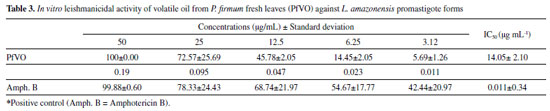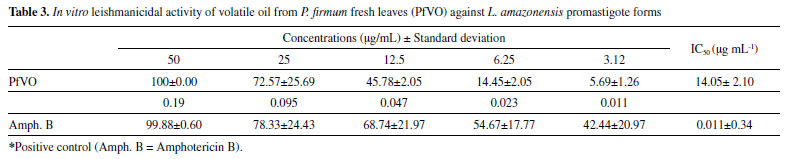Although the chemical composition of VOs is determined by genetic factors, other factors can also promote significant changes in secondary metabolite production. Different stimulation in the environment where plants live can direct their metabolic pathway and promote biosynthesis of different compounds. These factors include plant microorganisms, plant-plant interactions, age and stage of development. Besides, abiotic factors, such as luminosity, temperature, rainfall, nutrition, harvest time and season, exert influence on plants, as well as harvest and post-harvest techniques. These factors can act separately or in combination.24 It is remarkable that plants that belong to the genus Psidium have always drawn researchers' attention due to their botanical, chemical and pharmacological aspects. For instance, linalool is relevant in the volatile oil from P. myrsinites, since this monoterpene is important as a fragrance fixer to the perfume industry.25 Chemical analyses of volatile oils from P. salutare, P. striatulum, P. guajava and P. cattleianum have already revealed their high concentrations of the bioactive sesquiterpene β-caryophyllene. On the other hand, juicy fruit from P. acutangulum have become popular food on the seashore in Paraná state, Brazil.25 In short, several biological activities exhibited by plants that belong to the genus Psidium have been attributed to components of volatile oils, which are mostly found in leaves.25 Antileishmanial activity Antileishmanial activity of PfVO was evaluated against Leishmania amazonensis promastigote forms. Results showed that PfVO affected promastigote growth in a dose-dependent manner (Table 3). IC50 value of PfVO was 14.05 µg mL-1, while the one of amphotericin B was 0.011 µg mL-1 (positive control). In current literature, natural products whose IC50 values range between 10 and 50 µg mL-1 are considered active.26