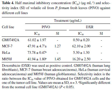 Antiproliferative activity In this study, three different human tumor cell lines were used: breast adenocarcinoma (MCF-7), cervical adenocarcinoma (HeLa) and glioblastoma (M059J). A normal human cell line (lung fibroblasts, GM07492A) was included to evaluate whether the natural product under investigation had selective activity. Cell lines were maintained as monolayers in plastic culture medium (HAM-F10 + DMEM, 1:1, Sigma-Aldrich), supplemented with 10% fetal bovine serum (Nutricell), antibiotics (0.01 mg mL-1 streptomycin and 0.005 mg mL-1 penicillin; Sigma-Aldrich) and 2.38 mg/mL Hepes (Sigma-Aldrich). Cells were incubated at 36.5 °C in a humidified 5% CO2 atmosphere. Antiproliferative activity was measured by the in vitro Toxicology Colorimetric Assay Kit (XTT; Roche Diagnostics), in agreement with the manufacturer's instructions. In the experiments, cells (104 cells/well) were placed on 96-well microplates. Each well got 100 µL HAM-F10/DMEM medium with volatile oil at concentrations ranging from 3.91 to 500 µg/mL. Negative (no treatment), solvent (0.02% DMSO, dimethylsulfoxide, Sigma-Aldrich) and positive (doxorubicin, DXR, Pharmacia Brasil Ltda.) controls were included. After incubation at 36.5 °C for 24 h, the culture medium was removed. Cells were washed with 100 µL PBS (phosphate buffered saline), to remove treatments, and then exposed to 100 µL culture medium HAM-F10 without phenol red. Afterwards, 25 µL XTT was added and cells were incubated at 36.5 °C for 17 h. Sample absorbance was determined by a multi-plate reader (ELISA - Tecan - SW Magellan vs 5.03 STD 2P) at wavelength of 450 nm and reference length of 620 nm. Antiproliferative activity was assessed with the use of IC50, the concentration that was able to inhibit 50% of the cell line growth as a response parameter, which was calculated by the GraphPad Prism program by plotting cell survival against the respective concentrations of the natural product under investigation. One-way ANOVA was used for comparing means (P≤0.05). Experiments were performed in triplicate. The selectivity index was calculated by dividing the IC50 value of the volatile oil obtained for GM07492A cells by the IC50 value obtained for the tumor cell line. This methodology was described by Alves et al.21