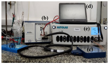 ![]() Figura 1. Aparato experimental. (a) célula eletroquímica, (b) controladora NI PXIe-1071, (c) módulo PXIe-6355, (d) computador, (e) potenciostato