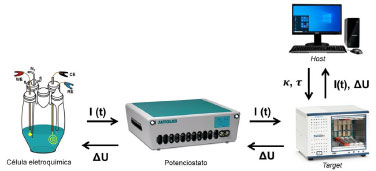 O módulo PXIe-6355 foi configurado para a leitura do sinal emitido pelo potenciostato no modo single ended ground reference (RSE), sendo 2 cabos conectados na placa, uma no polo positivo, outro no terra. Nessa porta, a placa lê o sinal de corrente registrada no potenciostato, como será discutido adiante. A equação do controle é resolvida, e o sinal do potencial a ser aplicado é emitido pela controladora, e lido pelo potenciostato pela mesma entrada BNC. A Figura 1 mostra o aparato experimental. O contato entre os elementos que compõem o sistema de controle precisa ocorrer de tal modo que a controladora tenha uma resposta rápida aos dados de corrente elétrica lidos no sistema eletroquímico. Visto essa necessidade, desenvolveu-se um sistema em real-time, utilizando-se um dispositivo denominado host, que no caso foi um computador (Figura 1 (d)), usado para que o usuário possa controlar a máquina, e outro dispositivo denominado target, que corresponde à controladora (Figura 1 (b)). O sistema em real-time permite uma otimização do tempo de processo a partir da divisão das tarefas executadas. Enquanto o target é encarregado pela determinação do potencial adicional ΔU a ser aplicado, o host permite que o usuário faça as alterações desejadas no controle, além de ser responsável pelo registro dos dados coletados. As principais interações entre o host (computador), o target (controladora), o potenciostato e a célula eletroquímica são ilustradas na Figura 2.