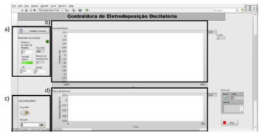 ![]() Figura 3. Interface host; a) ajuste dos parâmetros de controle (τ e κ); b) visualização de I(t) e I(t - τ); c) registro dos dados; d) visualização de ΔU calculado e aplicado