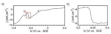 ![]() Figura 4. Varredura catódica do décimo ciclo do experimento de voltametria cíclica do sistema Cu/Sn; a) varredura completa, de 0,4 V a -0,8 V; b), ampliação da região de potencial entre -0,4 e -0,5 V, para uma melhor visualização da NDR, que ocorre na entre -0,45 e -0,47 V