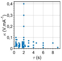 Esse tipo de comportamento permite que a aplicação de um potencial constante na região da NDR provoque um perfil oscilatório na corrente, como explicado teoricamente por Koper,34 justificando a escolha do sistema como modelo de reações eletroquímicas oscilatórias. Observa-se a partir da voltametria cíclica, portanto, o potencial de surgimento da NDR, e esse potencial é utilizado para a realização do experimento de cronoamperometria. Nesse experimento, são observadas oscilações de corrente com a aplicação constante do potencial da NDR, assim como o relatado nos trabalhos de Nakanishi et al.17-19 e também em Menezes et al.6 Após a estabilização das oscilações, o controle era aplicado no sistema. A Figura 5 apresenta um diagrama que indica as combinações dos parâmetros κ e τ utilizados na aplicação do controle nos experimentos.