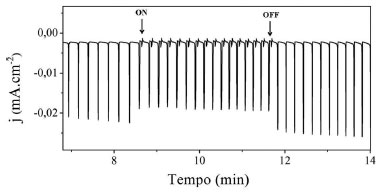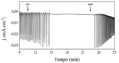 ![]() Figura 6. Controle da eletrodeposição utilizando os valores de κ = 0,02 V mA-1 e τ = 1,725 s, ligado em 8,6 minutos e desligado em 11,8 minutos, aproximadamente