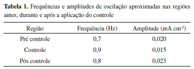 A região em que o controle foi aplicado ainda apresenta oscilações, variando sua amplitude, frequência e morfologia, sendo que quando o controle é desligado, em 11,8 min, os padrões retornam a oscilações parecidas com as iniciais, porém com amplitude maior e período ligeiramente menor. Valores aproximados de frequência e amplitude para cada região do gráfico são apresentadas na Tabela 1.