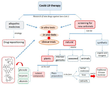 SCREENING OF MEDICINAL PLANTS AND PHYTOCHEMICALS WITH POTENTIAL TO INHIBIT THE NOVEL CORONAVIRUS SARS-CoV-2 Coronavirus (CoV) is a positive sense single-stranded RNA (ssRNA) virus that belongs to the Coronaviridae family. Viral species belonging to this family cause infection of the upper respiratory and gastrointestinal tracts in mammals and birds, and in humans, mainly cause a common cold, but complications can occur, including pneumonia. The best known human coronaviruses (HCoV) are the most widely known severe acute respiratory syndrome coronavirus (SARS-CoV) that caused a global threat with high mortality in 2003, the Middle East respiratory syndrome coronavirus (MERS-CoV) that is associated with high lethality, and the Severe Acute Respiratory Syndrome Coronavirus 2 (SARS-CoV-2), which is responsible for the current COVID-19 pandemic.11-13 The novel coronavirus, SARS-CoV-2, is classified in the β-line from Betacoronaviruses, which includes the SARS-CoV and MERS-CoV viruses, whose particles have rounded or oval structures with an approximate diameter of 60-140 nm.14 The infection process begins with the entrance of the virus into the host cell and the subsequent production of the viral polyprotein that needs to be cleaved into effector proteins through the host cell machinery. The main coronaviral protease (3CLpro) and papain-like protease (PLpro) enzymes are the viral proteases responsible for the cleavage.15 Genomic approaches indicate that SARS-CoV-2 has a genome ranging from 29.8 kb to 29.9 kb and share 96% similarity in the coronavirus genome found in bats and 79.6% sequence identity to SARS-CoV.16 The COVID-19 infection caused by the SARS-CoV-2 represents one of the greatest epidemiological challenges of the century, and to date there are no effective antiviral agents for many strains of coronavirus, including SARS-CoV-2. Considering that there are no treatment options available for the treatment of COVID-19 and the development of a medicine can take decades, the drug repositioning strategy has been used (Figure 1). The drug repositioning strategy is a process of identifying new uses for approved or research drugs and it is considered a very effective tool for drug discovery, as it involves less time and cost to find a therapeutic agent compared to the new drug discovery process.17