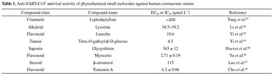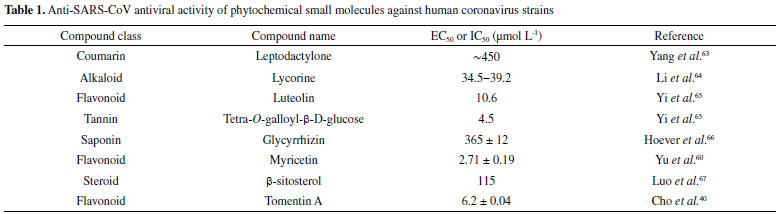 From the bibliographic research carried out in this review and discussed in the text, some phytochemicals and their respective classes of secondary metabolites (flavonoids, alkaloids, coumarin, tannins, saponin and steroid) with exclusive anti-SARS-CoV activity (IC50 in μmol L-1) were extracted. The most significant results are described in Table 1.