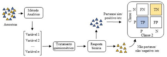 ![]() Figura 2. Representação esquemática do procedimento quimiométrico efetuado para a classificação das amostras (Adaptado de López118 e Nachtigall123)