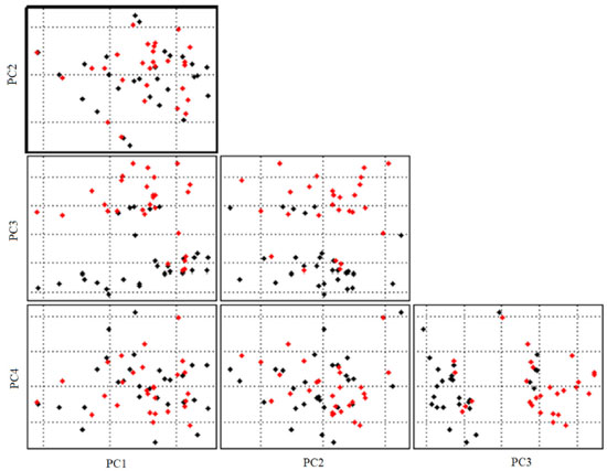 ![]() Figura 3. Resultado da PCA (Escores) para uma avaliação exploratória não supervisionada das diferentes composições das amostras