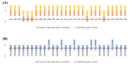 ![]() Figura 4. Classes indicadas pelo modelo SIMCA para as amostras de vidros do Lado (A) Interno e (B) Externo