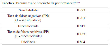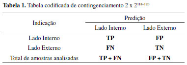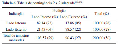Para o caso do Lado Interno (Figura 4A), observamos que a classificação inicial coincide com a classificação gerada pelo modelo SIMCA. Nesse caso, observamos ambas as respostas abaixo do eixo das amostras (eixo x). A mesma observação pode ser feita para as amostras do Lado Externo (Figura 4B), mas, nesse caso, as respostas estão acima do eixo. É possível observar que para a maioria das amostras iniciais a classificação foi realizada corretamente. Entretanto, com o intuito de avaliarmos com maior detalhamento essas respostas geradas pelo modelo SIMCA, adaptamos o modelo de tabela de contingência 2x2.118-120 Essa abordagem para análise foi utilizada, pois as respostas fornecidas pelo SIMCA são qualitativas, isso é, são respostas sobre classificação correta ou errada (positiva/negativa) ao indicado inicialmente. Como essa resposta é binária (certo/errado), não se pode utilizar meios quantitativos para realizar essa análise. Logo, estabelece-se essa probabilidade por meio de quatro possíveis cenários de resposta binária.118 Na Tabela 6 pode-se observar a frequência (porcentagem) das amostras classificadas corretamente e incorretamente em cada uma das classes modeladas com SIMCA. Com base nesses valores, podem-se analisar os parâmetros de sensibilidade e especificidade do modelo para a predição de uma nova amostra de para-brisas aplicando a técnica EDXRF. Logo, na Tabela 6 estão reunidos os valores avaliados e na Tabela 7 os parâmetros de descrição da performance do modelo.
