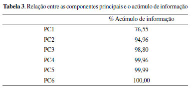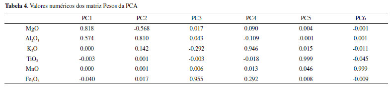 Os Pesos foram sistematizados na Tabela 4, onde pode-se observar a influência de cada uma das variáveis no arranjo das amostras nas componentes principais.