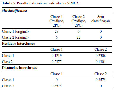 As informações agrupadas na Tabela 5 demostram que todas as amostras foram classificadas, não havendo amostras anômalas no modelo criado. As distâncias interclasses mostram um valor maior entre classes distintas do que entre os membros de uma mesma classe. O mesmo ocorre com os resíduos interclasses, pois esse parâmetro avalia o quão ajustado ao modelo criado estão aos dados. Os parâmetros avaliados por SIMCA indicam adequabilidade para predições de novas amostras por EDXRF. Além dessas respostas referentes aos parâmetros do modelo estatístico faz-se necessário avaliar a reclassificação dos dados originais. Esse procedimento tem como intuito verificar se amostras indicadas inicialmente em uma das classes realmente pertencem a ela. A Figura 4 agrupa os resultados de forma gráfica das predições do modelo SIMCA.