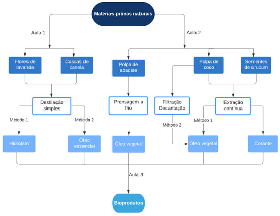 ![]() Figura 1. Etapas para a obtenção de bioprodutos a partir de matérias-primas naturais nas aulas de Química Orgânica experimental
