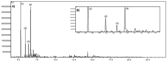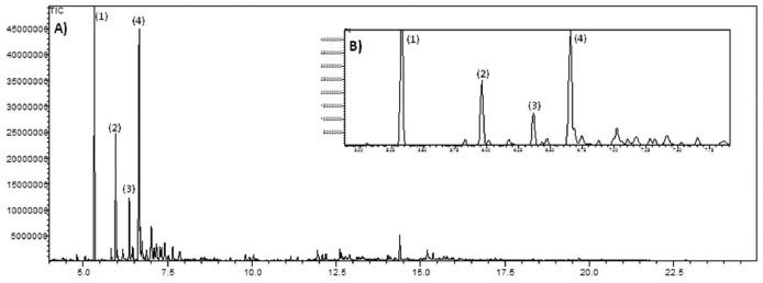 ![]() Figura 2. Cromatograma (A) e expansão do cromatograma (B) do óleo essencial de Lavandula dentata L. Constituintes majoritários do óleo: (1) 1,8-cineol, TR: 5,3 min ; (2) fenchona TR: 5,9 min; (3) fenchol TR: 6,3 min e (4) cânfora TR: 6,6 min