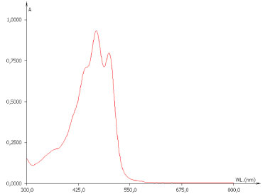 ![]() Figura 3. Espectro de absorção UV-Vis do extrato das sementes de Bixa orellana; Solvente: clorofórmio