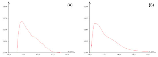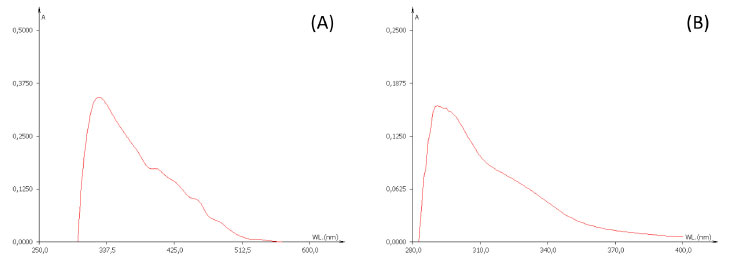 ![]() Figura 4. Espectro de absorção no UV-Vis do óleo de abacate (A) e óleo de coco (Método 1) (B); 0,1 mg mL-1 em clorofórmio