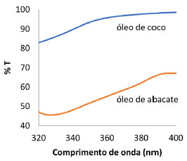 ![]() Figura 5. Espectro de transmitância dos óleos de abacate e coco na região do UVA